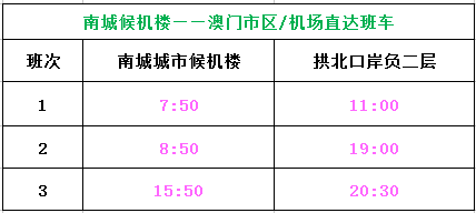 (2)澳门国际机场至澳门关闸,每天9:00—19:00通车,平均20分钟一班;